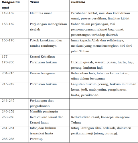 Subjek umum bagian kedua ini adalah pembentukan umat, yang mampu memerankan fungsi kekhalifahan. Pada akhir bagian pertama (bertepatan dengan akhir juz 1), tema terkait dengan perjuangan Ibrahim, salah satu episode yang muncul adalah pembangunan Ka’bah. Permulaan subjek umum ke-2 ini terkait dengan peralihan kiblat. Kemudian tema berkembang seputar identitas umat (kiblat), perjuangan, peraturan (hukum), esensi kebaikan, kepemimpinan, tugas kerasulan, konsepsi tauhid, pembuktian iman melalui infaq, penegasan hukum masalah transaksi finansial, kemudian ditutup dengan do’a. Tabel di bawah ini memberikan peta rangkaian ayat berikut tema dan sub-temanya.